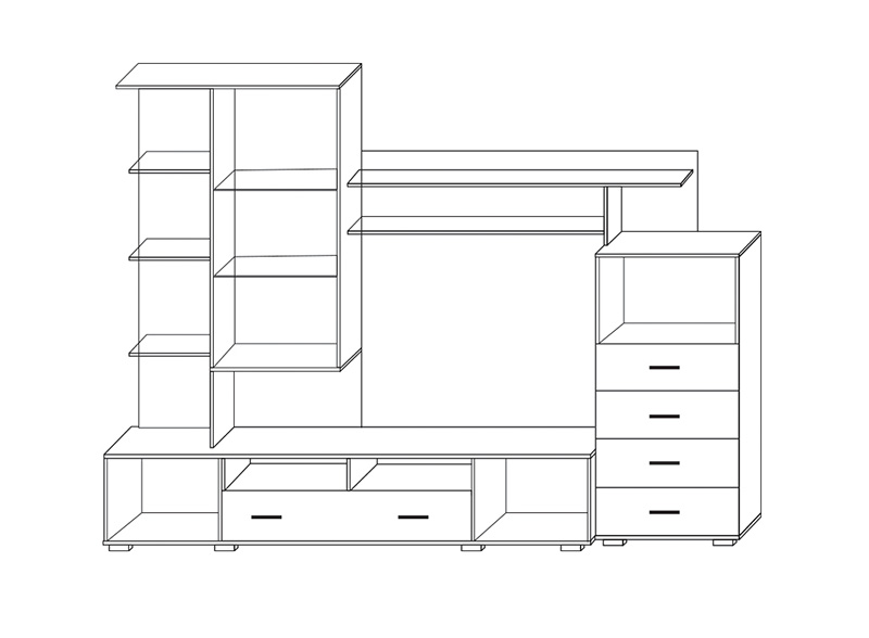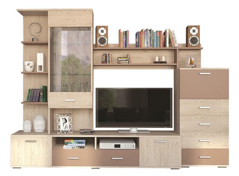 - Комплектація — тумба під ТВ, вітрини, полиця, комод.